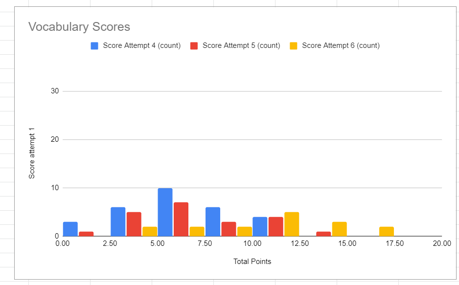 Insert the class vocabulary performance histogram. I created a spreadsheet of all core vocabulary words in our Latin program. This involved creating a cell for each possible form of each Latin word students should acquire throughout the program. Next I uploaded the spreadsheet terms into canvas using the respondus tool to create question banks for a vocabulary quiz.